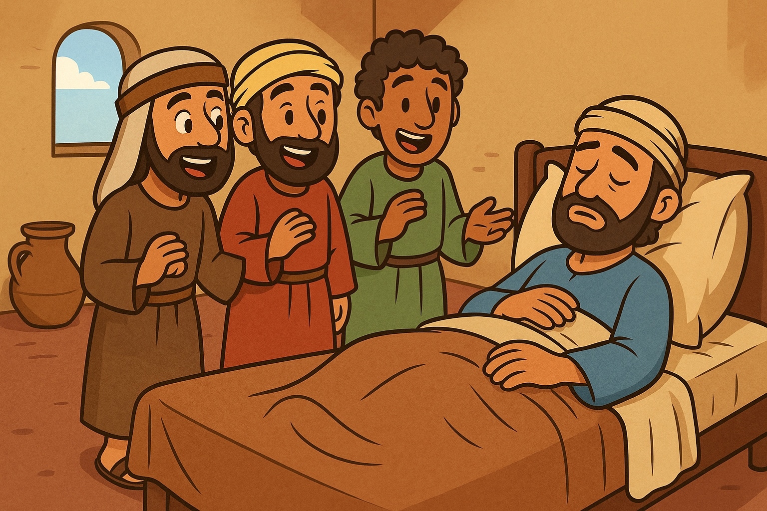 Когда Иов потерял всё — богатство, здоровье, семью, — к нему пришли друзья: Елифаз, Вилдад и Софар. Они сидели с ним семь дней и ночей в молчании, разделяя его скорбь. Хотя позже их советы оказались ошибочными, их первоначальный поступок был актом заботы и сочувствия. Настоящая дружба проявляется в том, чтобы быть рядом в моменты боли, даже если нет слов для утешения.